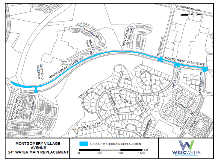 The work along Montgomery Village Avenue to replace the water main from Midcounty Highway to Centerway Road will resume in the next few weeks. This two-year project began in April 2022 and was anticipated to be finished toward the beginning of 2024. Due to recent material delays, the project is now expected to be completed in November 2024.